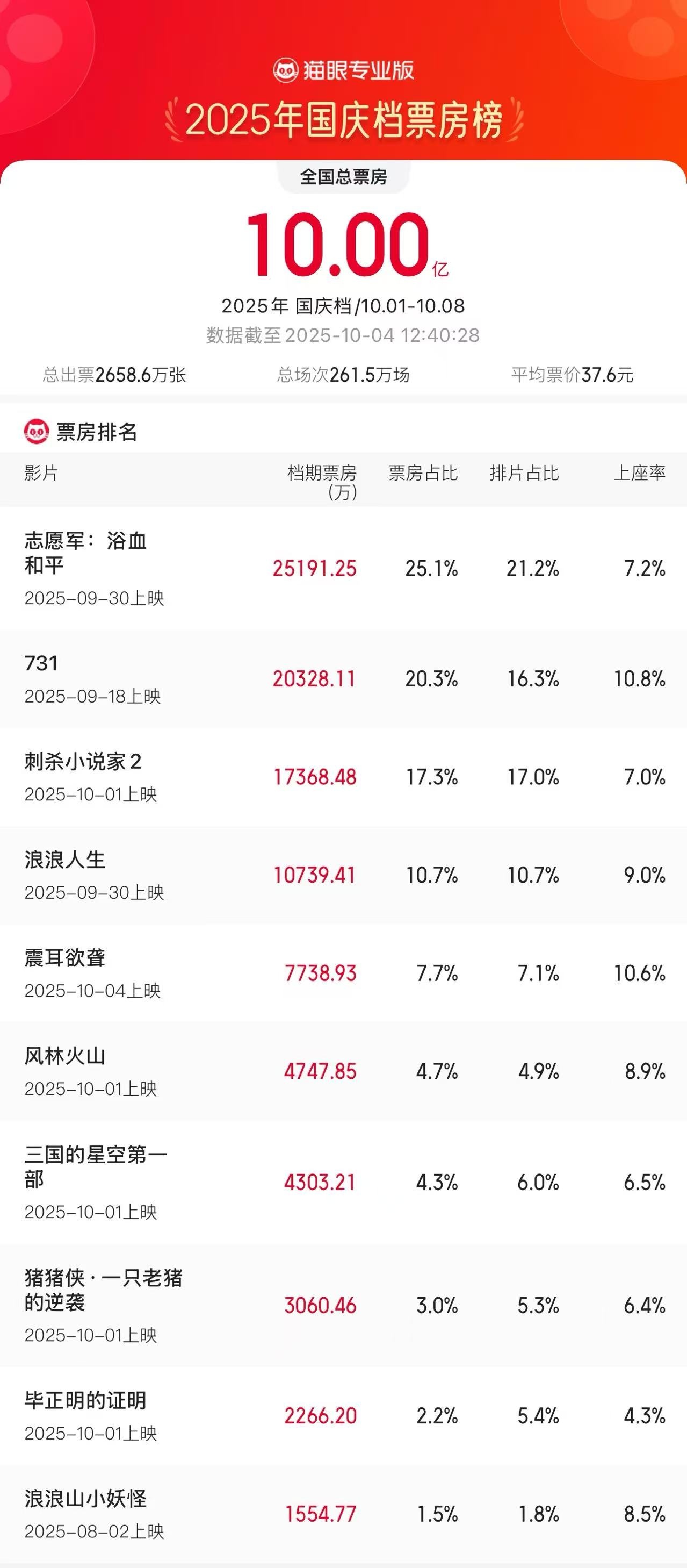 根据在线平台的数据,从10月4日的12:40开始,2025年全国时期的票房收入超过了10亿,其“自愿军:血腥和平”,“ 731”和“小说家2的谋杀案”分为前三名。