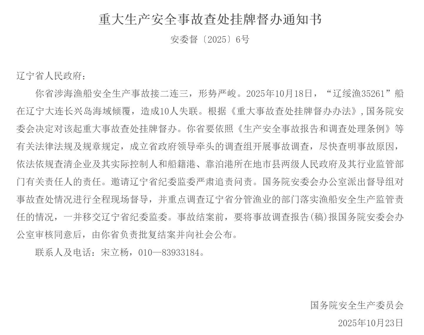 央视新闻:据应急管理部网站消息,2025年10月18日,“辽水渔35261”轮在辽宁省大连长兴岛外海倾覆,造成10人失踪。国务院安委会决定根据《重大事故督查处理挂牌处理办法》,对本次重大事故进行挂牌督办。