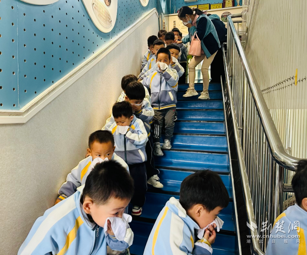 我的闹钟在上午 10 点响了。在班主任的带领下,所有孩子立即按照应急预案,用湿毛巾捂住口鼻,蹲下身子,在老年消防员的带领下,沿着指定路线撤离。各楼梯分配的安全疏散人员迅速部署,各尽其责,安全有序地进行疏散。各班迅速通过校园两个安全出口到室外操场集合。时间整个训练过程紧张、激烈、有条不紊。
