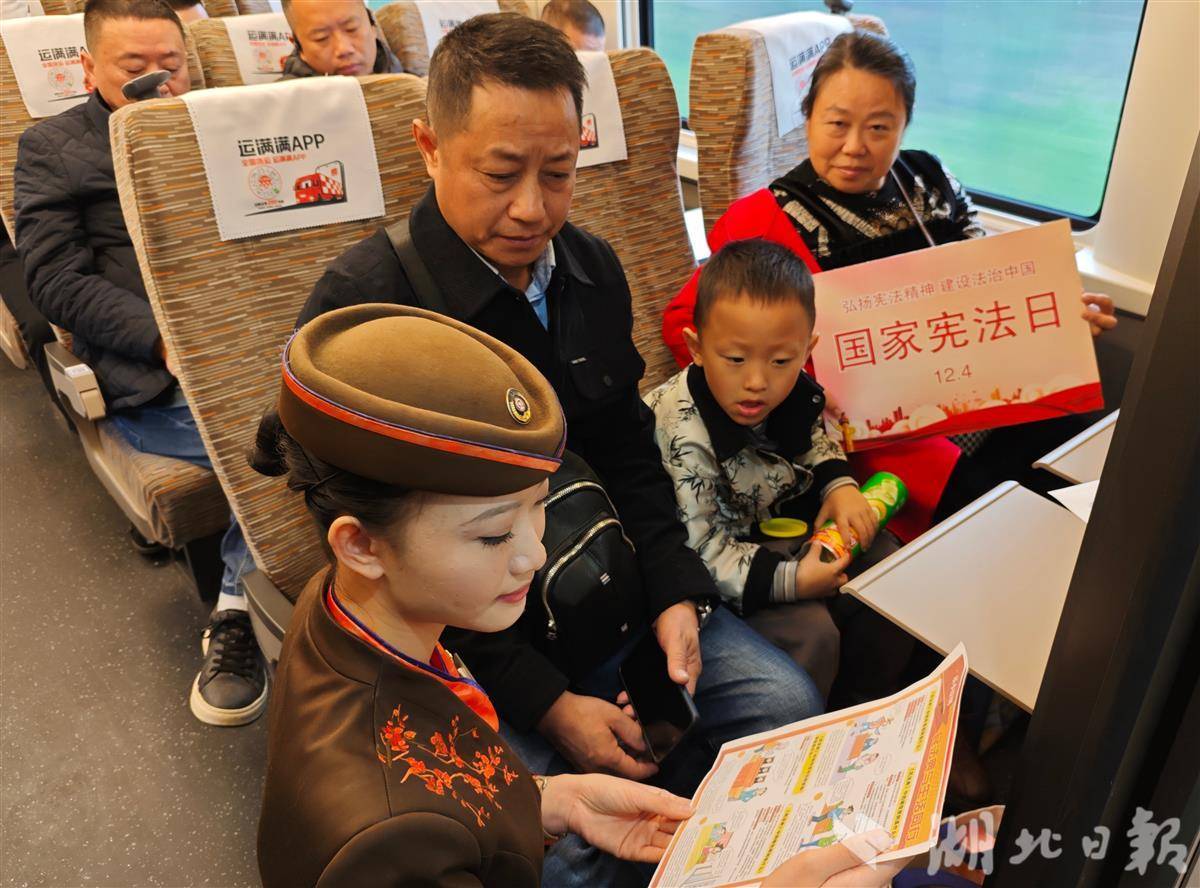 12月2日,司机和乘客在武汉客运区武汉南线动车组车间运营的G1017次高铁上开展了主题为“宪法在我身边,安全乘高铁”的普法宣传活动。每年12月4日庆祝宪法日。活动中,列车长孟彩红变身“法制宣传员”,在列车上设置法律传播角,向旅客发放宪法和铁路运输相关资料,并进行详细讲解。针对旅客关心的座位关闭、危险物品入境、车辆秩序混乱等常见问题,结合《中华人民共和国民法》、《铁路安全管理条例》等相关法律法规,进行通俗易懂的讲解。乘客被明确告知法律含义,例如“堵塞座位属于违法行为,将受到刑事处罚”等。(湖北日报记者 赵玉燕 摄)在武汉客运局武汉南线动车车间运营的G1017次高铁列车上,司乘人员开展了以“宪法与我同行,安全上高速”为主题的普法宣传活动。在武汉南线动车车间武汉客运段运营的G1017次高铁上,司乘人员共同开展了主题为“宪法在我身边,我安全乘车高铁”的法制宣传活动。主题为“宪法在我身边,我安全乘高铁”。